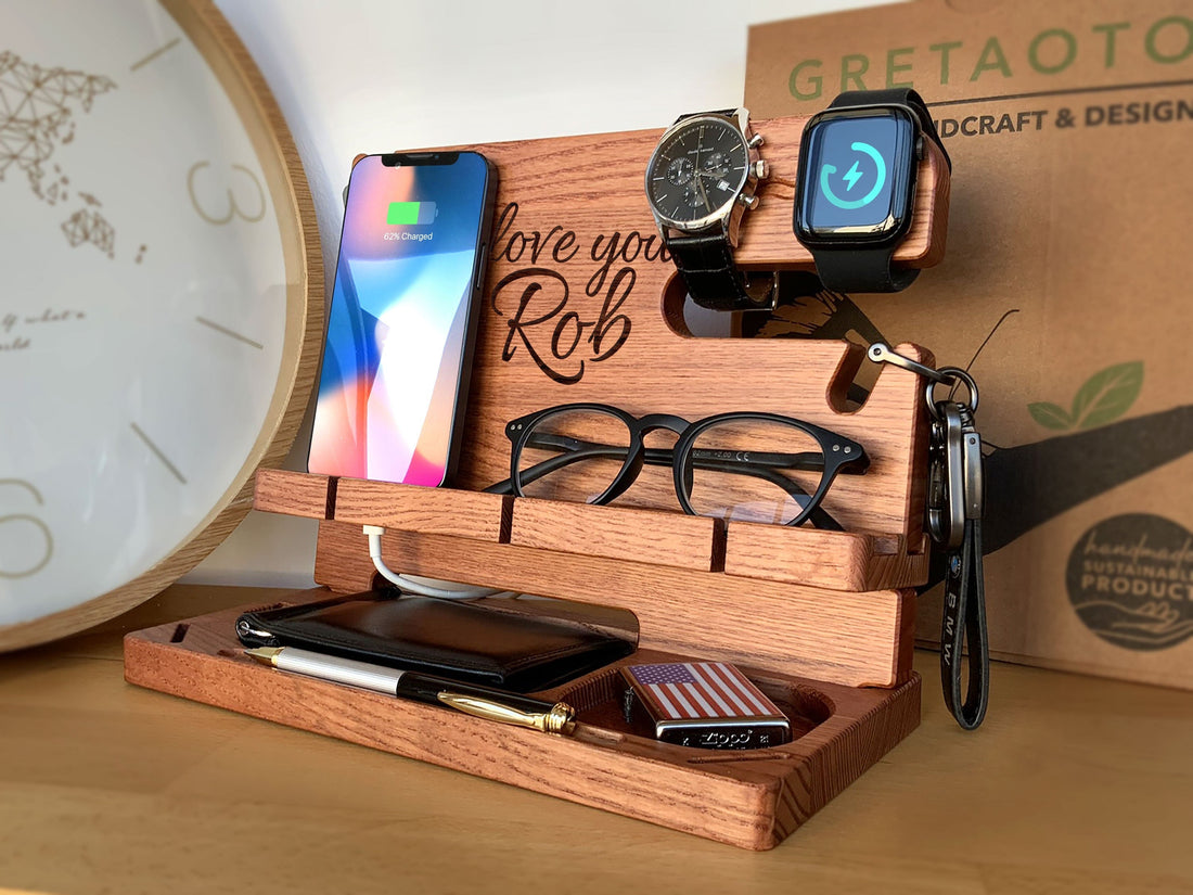 Wood Personalized Docking Station for Cell Phone, Tablet, Wallet, Gadgets, Watch, Keys, Accessories, Desk Organizer, Gifts for Men (Moroon)
