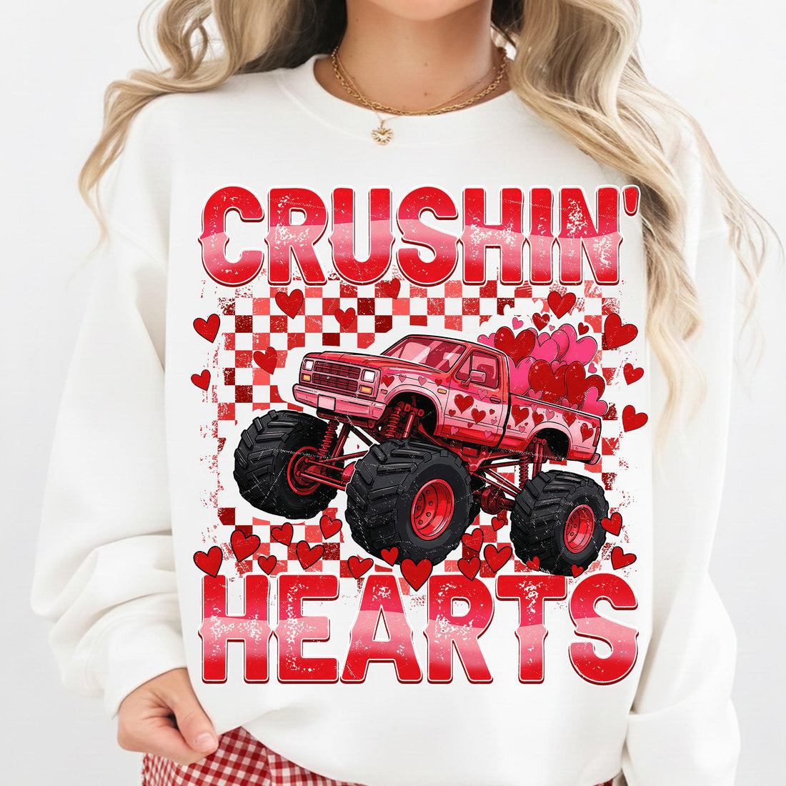 Retro Valentine Monster Truck, Checkered Crushin Hearts Toddler Shirt Design, Trendy Valentine Kids , XOXO Love VDay Png