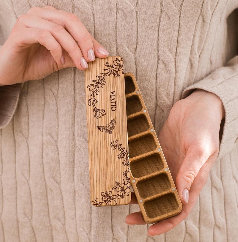 7 Day Pill Box For Purse With Custom Name, Wooden Pill And Vitamin Organizer, Birth Control Case, Small Pill Container And Trinket Box Gift