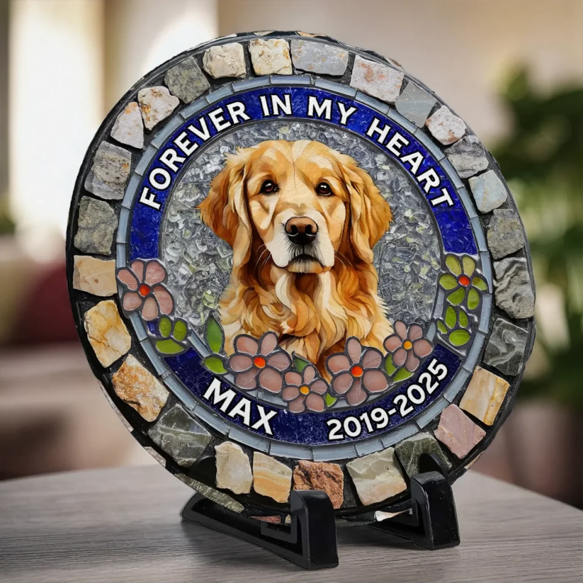 Custom Photo Forever Loved, Never Forgotten - Memorial Personalized Custom 3D Mosaic Faux Stained Glass Print Round Shaped Memorial Stone - Sympathy Gift For Pet Owners, Pet Lovers