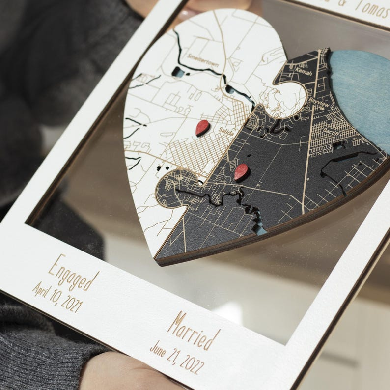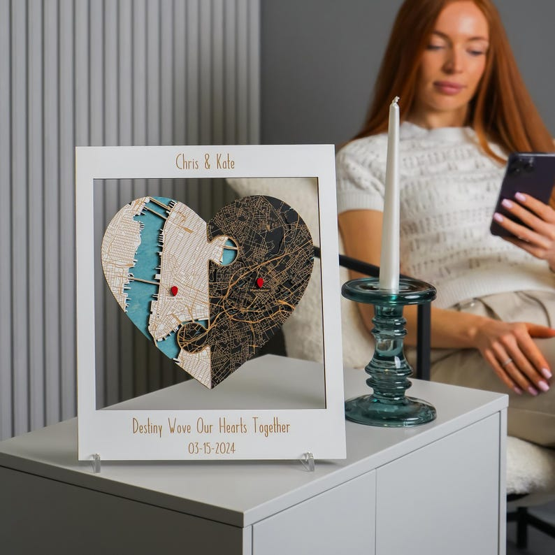 Newly Wed Gifts, Two Locations Heart Puzzle Map Wooden Framed Wall Art, Personalized Wedding Gifts for Couple, 5th Anniversary Gift for Wife