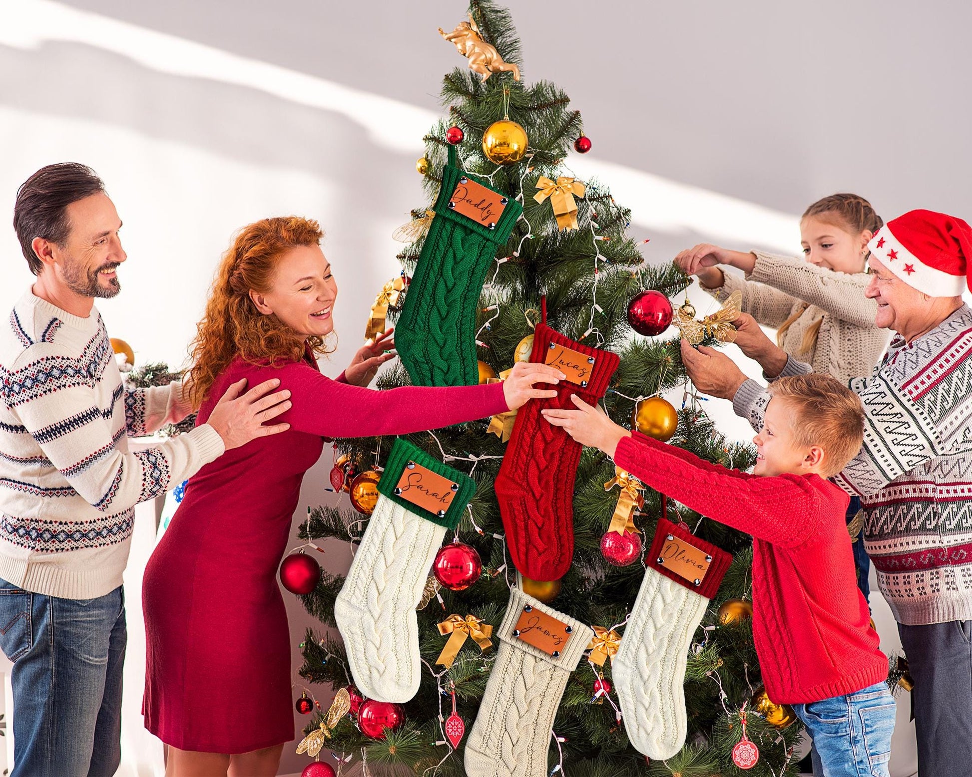 Personalized Christmas Stockings, 2025 Custom Stocking with Name, Knitted Stockings, Engraved Leather Patch Stockings